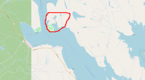 The red circular on above map shows the area of the Maude Island Trail. Morte Lake is the lake to the right of the red circular. Heriot Bay is bottom-right area of map.